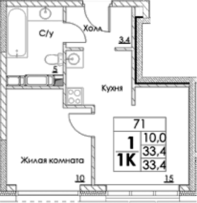 1-комнатная квартира № 71, 33.40 м2 без отделки 9 эт.