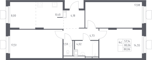 4-комнатная квартира № 153, 80.06 м2 с отделкой 17 эт.