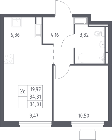 2-комнатная квартира № 396, 34.31 м2 с отделкой 10 эт.