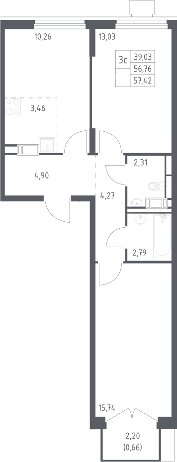 3-комнатная квартира № 418, 56.76 м2 с отделкой 15 эт.