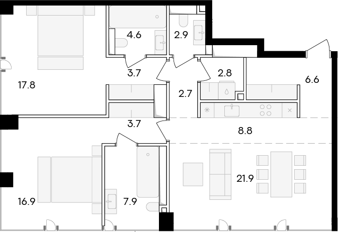 3-комнатная квартира № 70, 100.30 м2 без отделки 19 эт.
