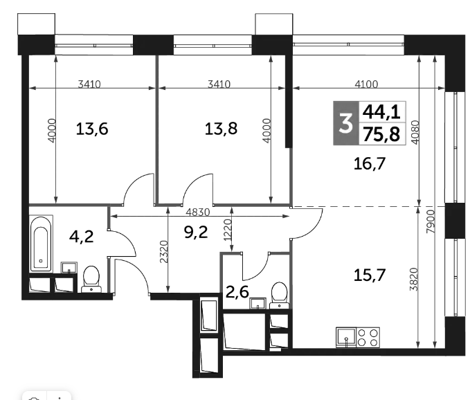 3-комнатная квартира № 1372, 75.80 м2 без отделки 22 эт.