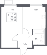 1-комнатная квартира № 316, 38.38 м2 с отделкой 8 эт.