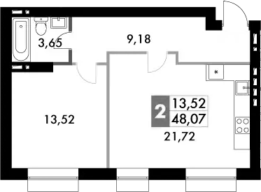 2-комнатная квартира № 18, 48.07 м2 без отделки 4 эт.