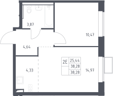 2-комнатная квартира № 277, 38.28 м2 с отделкой 6 эт.