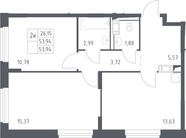 2-комнатная квартира № 2, 53.94 м2 с отделкой 1 эт.
