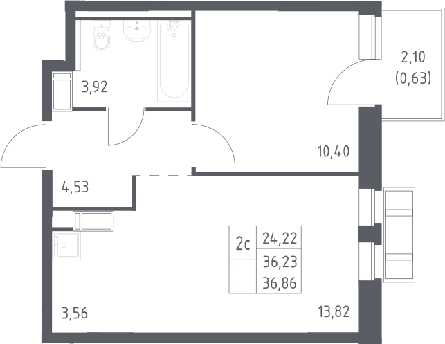 2-комнатная квартира № 539, 36.23 м2 с отделкой 9 эт.