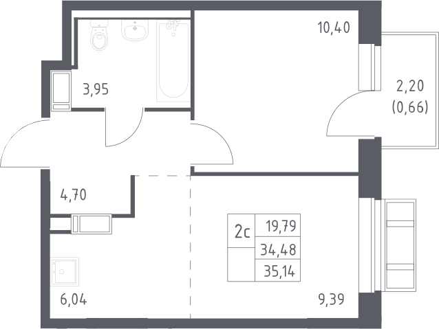 2-комнатная квартира № 217, 34.48 м2 с отделкой 9 эт.