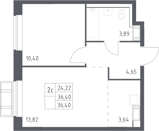 2-комнатная квартира № 222, 36.40 м2 с отделкой 9 эт.