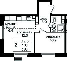 2-комнатная квартира № 114, 38.10 м2 без отделки 3 эт.