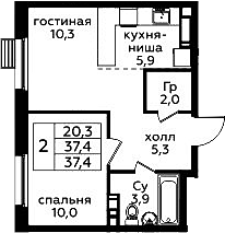 2-комнатная квартира № 203, 37.40 м2 с отделкой 3 эт.