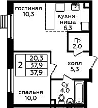 2-комнатная квартира № 187, 37.90 м2 с отделкой 2 эт.