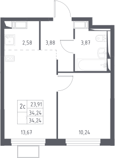 2-комнатная квартира № 21, 34.24 м2 с отделкой 3 эт.
