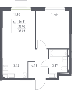2-комнатная квартира № 167, 38.03 м2 с отделкой 17 эт.
