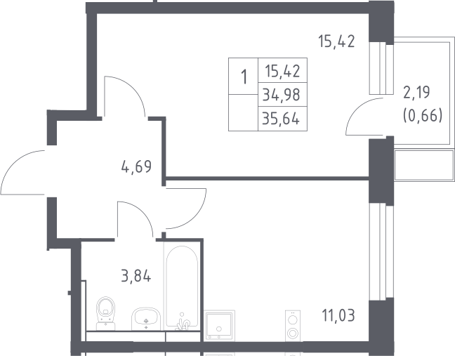 1-комнатная квартира № 144, 34.94 м2 с отделкой 13 эт.