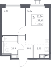 2-комнатная квартира № 324, 32.61 м2 с отделкой 17 эт.