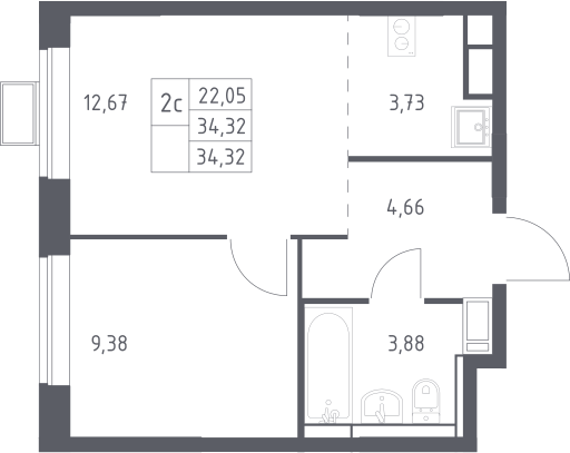2-комнатная квартира № 207, 34.32 м2 с отделкой 4 эт.