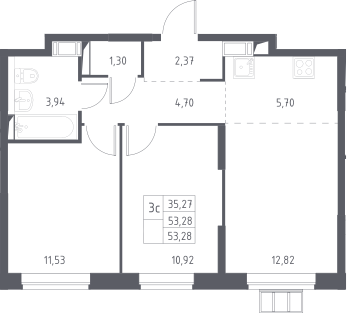 3-комнатная квартира № 19, 53.28 м2 с отделкой 3 эт.