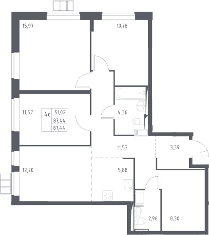 4-комнатная квартира № 89, 87.44 м2 с отделкой 10 эт.