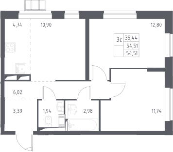 3-комнатная квартира № 137, 54.51 м2 с отделкой 14 эт.