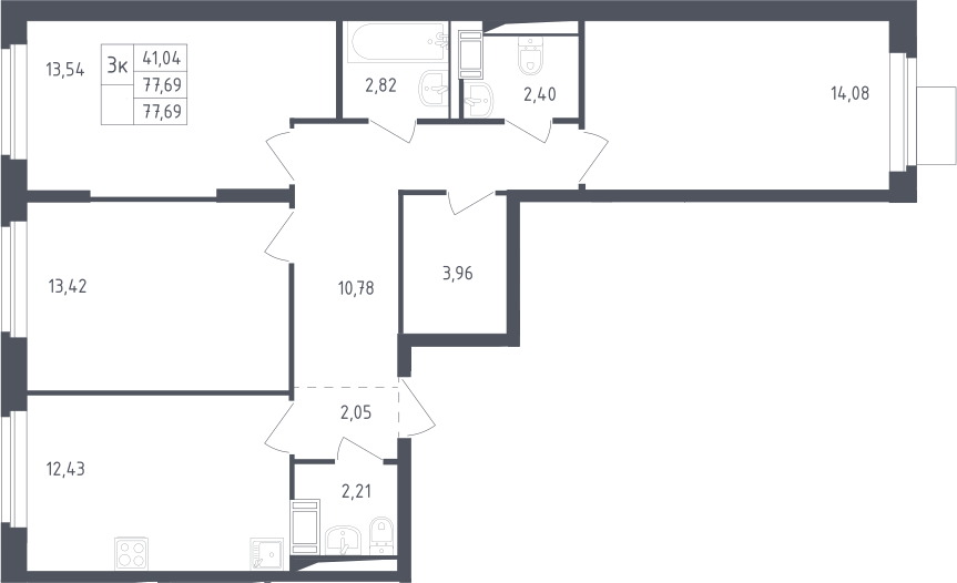 3-комнатная квартира № 749, 77.69 м2 с отделкой 2 эт.