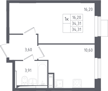 1-комнатная квартира № 122, 34.31 м2 с отделкой 7 эт.