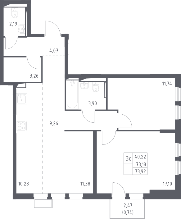 3-комнатная квартира № 174, 73.18 м2 с отделкой 3 эт.