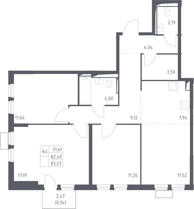 4-комнатная квартира № 199, 82.49 м2 с отделкой 5 эт.