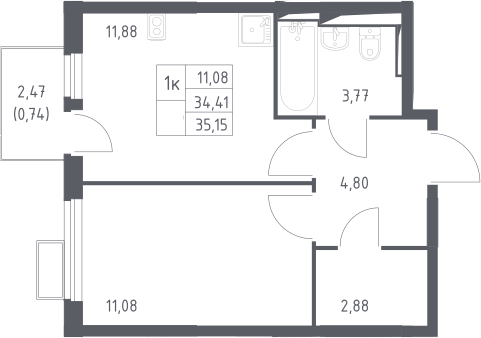 1-комнатная квартира № 336, 34.41 м2 с отделкой 3 эт.