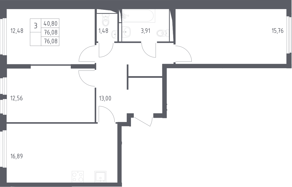 3-комнатная квартира № 450, 76.08 м2 с отделкой 6 эт.