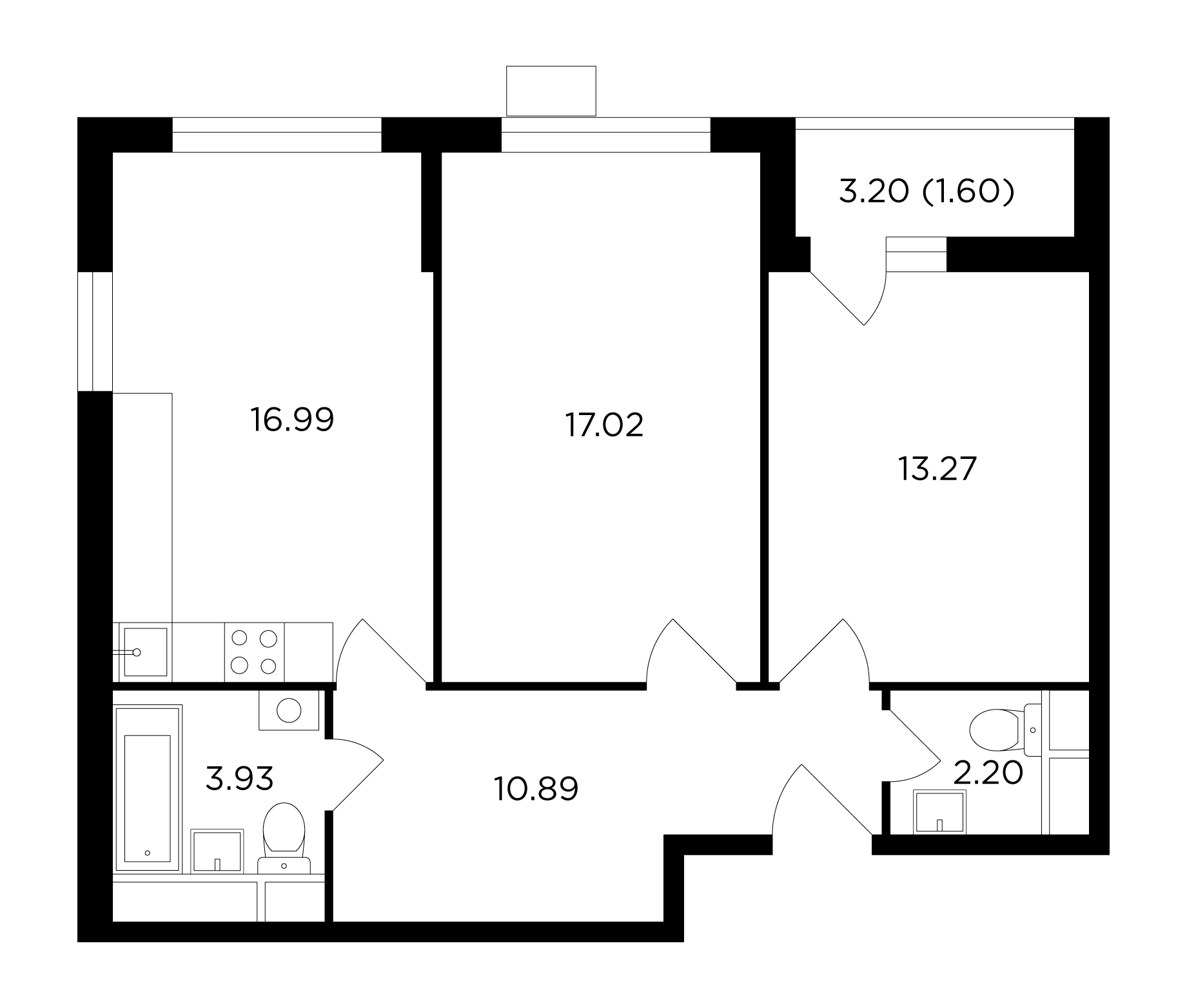 3-комнатная квартира № 46, 64.30 м2 без отделки 5 эт.