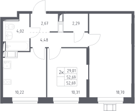 2-комнатная квартира № 149, 52.69 м2 с отделкой 3 эт.
