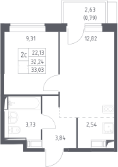 2-комнатная квартира № 204, 32.24 м2 с отделкой 7 эт.