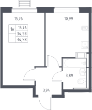 1-комнатная квартира № 145, 34.58 м2 с отделкой 3 эт.