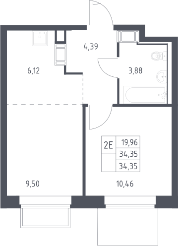 2-комнатная квартира № 424, 34.35 м2 с отделкой 6 эт.