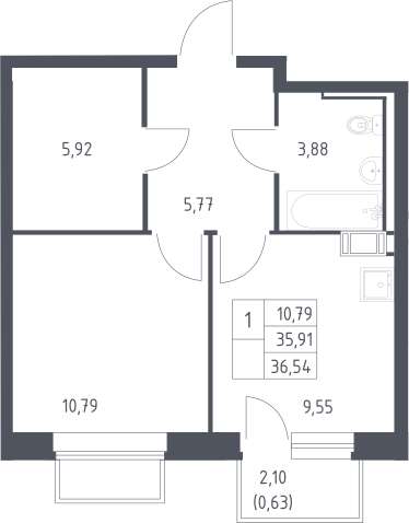 1-комнатная квартира № 463, 35.91 м2 с отделкой 14 эт.